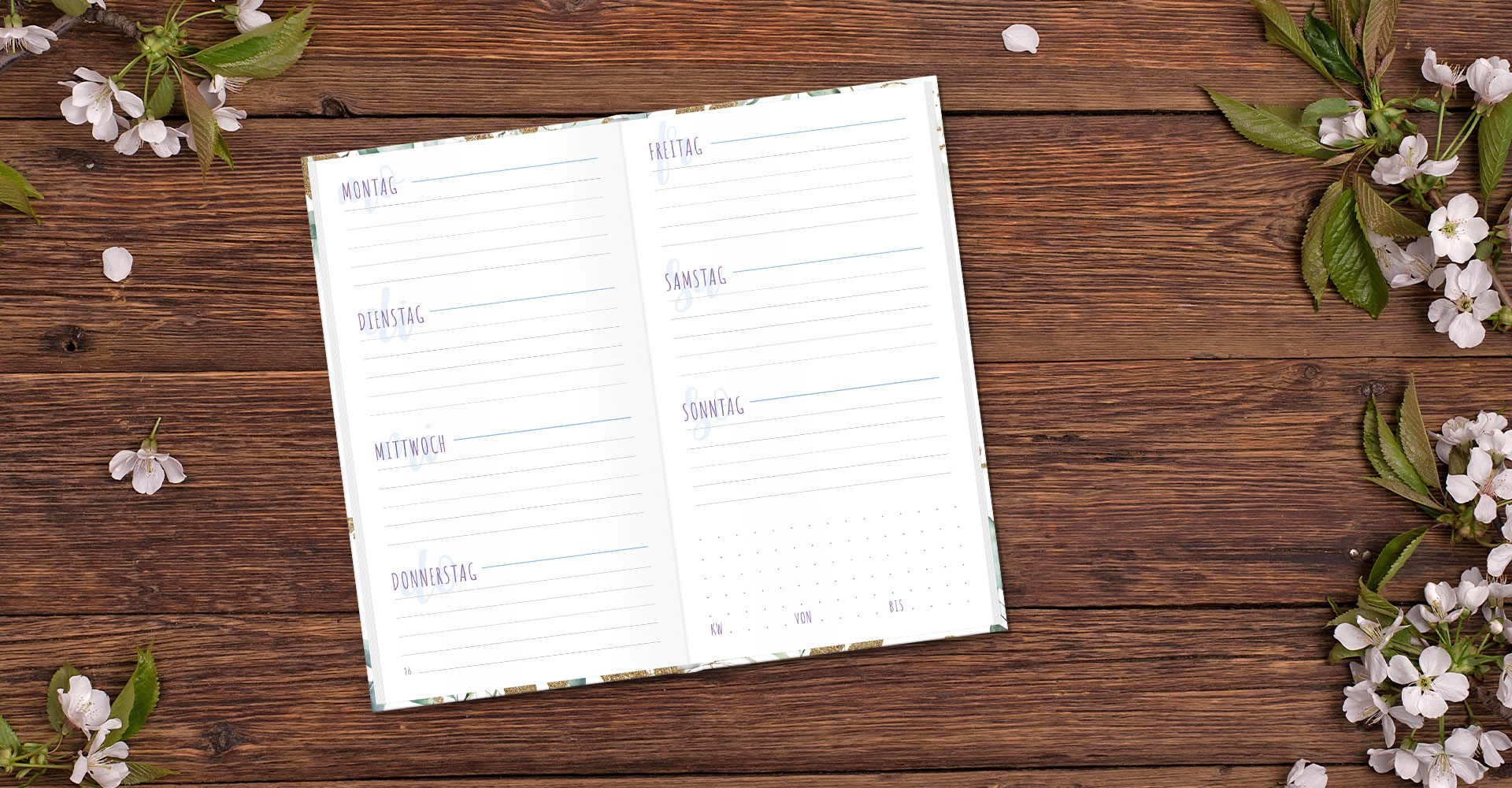 Die vertikale Aufteilung mit den linierten Tagesfeldern und einem gepunkteten Notizfeld pro Woche bieten genügend Raum für Termine und kreative Gedanken.