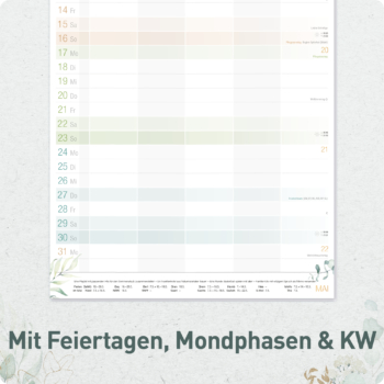 Für fünf bzw. sieben Familienmitglieder ausgelegt, besticht der Wandkalender durch farblich getrennte Wochen, Feiertage- und Schulferienübersichten, Freizeit-/Planungstipps, Mondphasen, Sonnenauf- und -untergangszeiten.