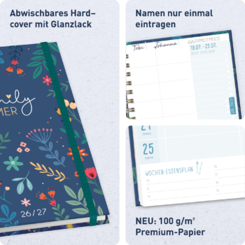 Sparen Sie Zeit bei der wöchentlichen Organisation: Die Namen der Familienmitglieder werden einmalig direkt auf dem stabilen Hardcover eingetragen. Dank der cleveren Gestaltung bleiben die Namen das ganze Jahr über für jede Woche sichtbar.