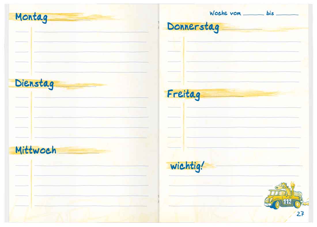 Klare Wochenstruktur, kindgerechte Aufteilung und flexible Nutzung über 30 Wochen sorgen schon in der Grundschule für einfache Organisation! Lustige Figuren erklären, wie das Führen eines Hausaufgabenheftes funktioniert.