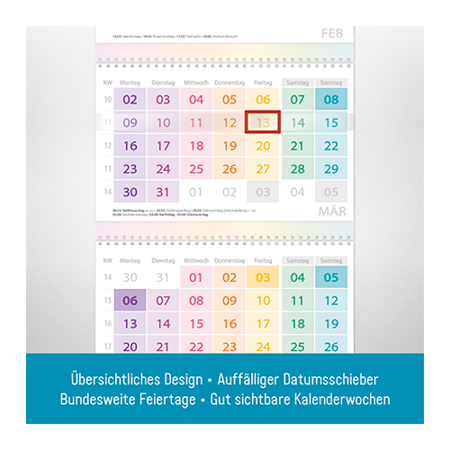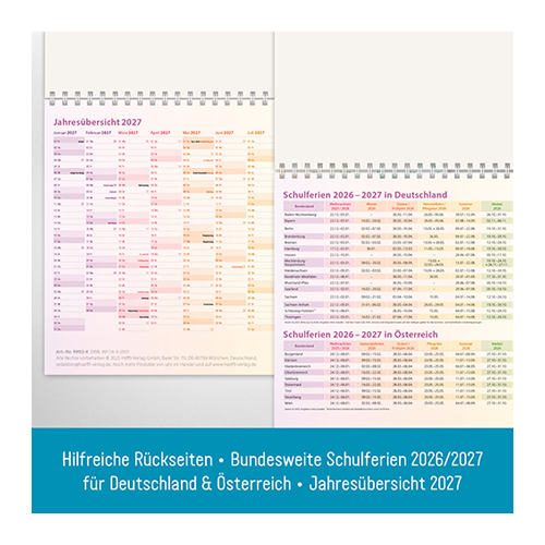 Der 3-Monatskalender 2026 deckt alle individuellen Planungsbedürfnisse ab – entweder zwei Monate im Voraus planen oder den Rückblick auf vergangene Wochen im Auge behalten. Mit dem farbigen Schieber lässt sich ganz einfach der aktuelle Tag kennzeichnen, sodass die am häufigsten benötigte Info immer parat ist. Die schönen Farben machen den 3-Monatskalender einzigartig und zu einem echten Hingucker. Obendrauf gibt es, wie immer bei Häfft, smarte Dreingaben: wichtige Feiertage, Ferientermine und eine kompakte Jahresübersicht.