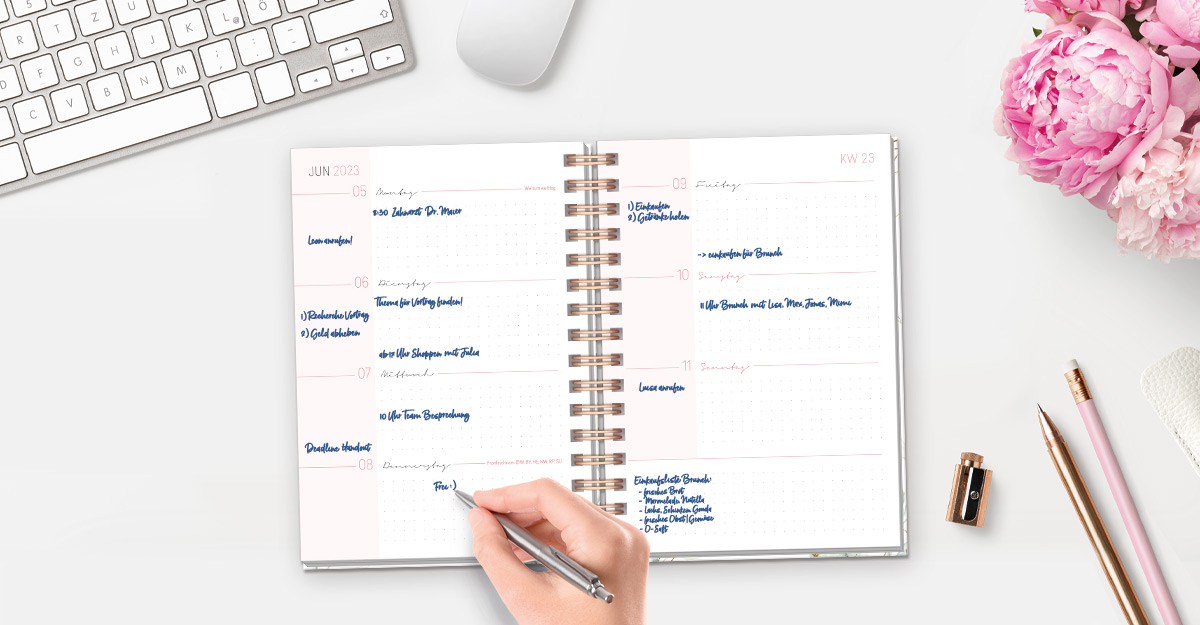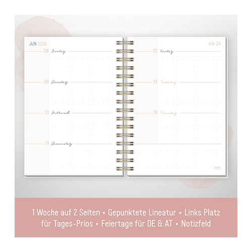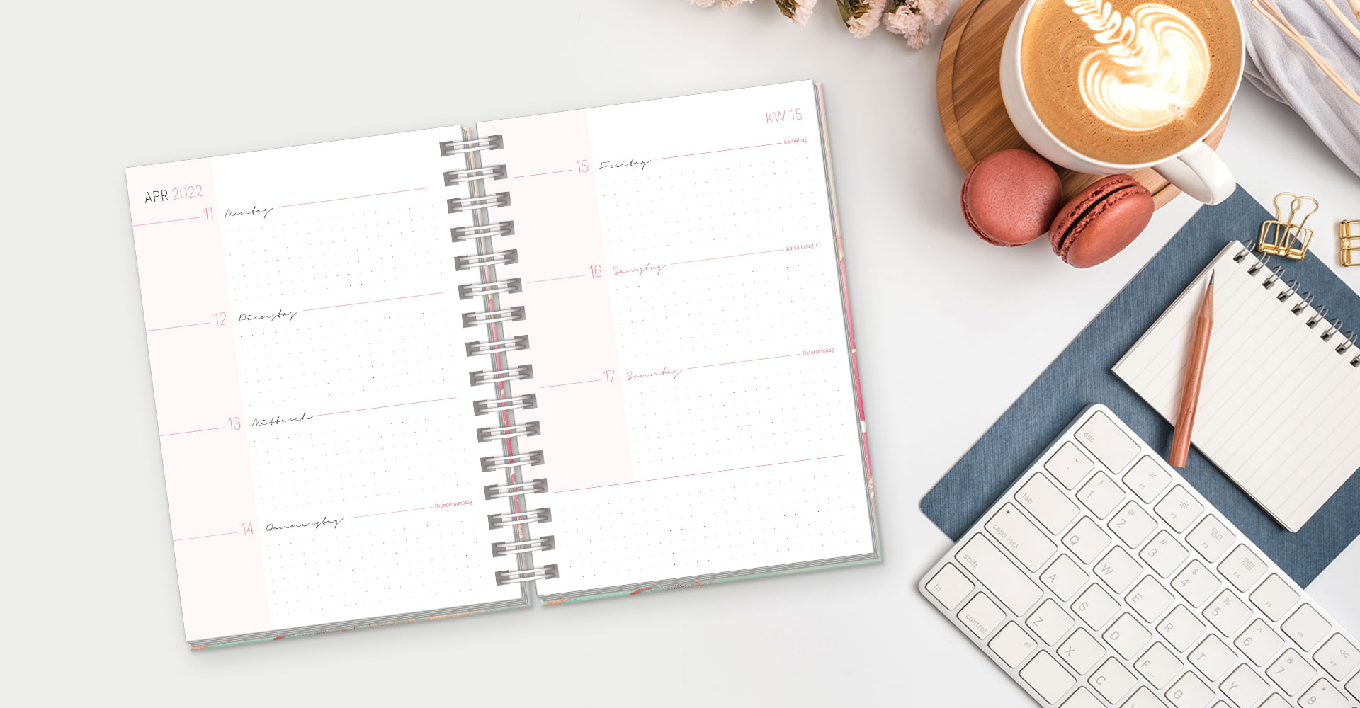 Der Lieblings-Timer ist ein Hardcover-Wochenkalender mit Spiralbindung. Jede Woche wird auf zwei Seiten dargestellt und bietet somit viel Platz für Notizen & To-dos.