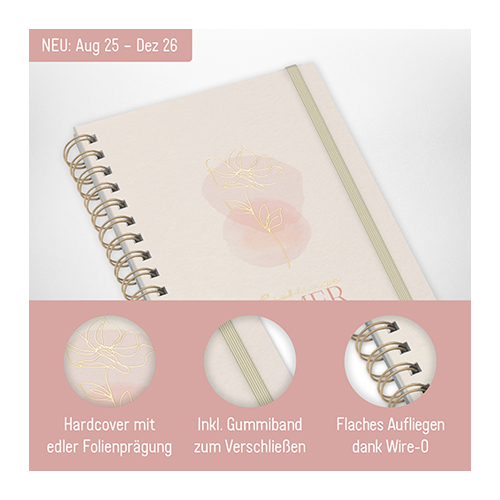 Dank des handlichen A5-Formats (21,2 x 16,9 cm) passt der Lieblings-Timer in (fast) jede Tasche. Und das robuste Hardcover macht so einiges mit. Viel Freude beim Planen!