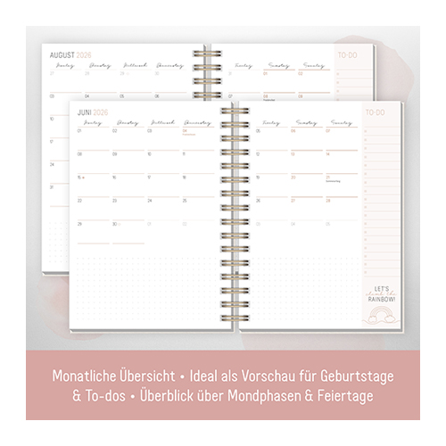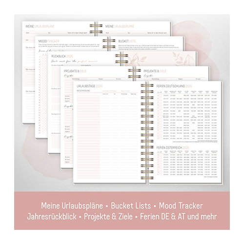 Vielseitige Sonderseiten wie Wochenpläne, Projekt- und Zielplaner, Bucketlists, Mood-Tracker, Kontaktlisten, Jahresübersichten, Schulferien & Feiertage, Urlaubstracker und mehr decken alle Organisationsbedürfnisse ab.