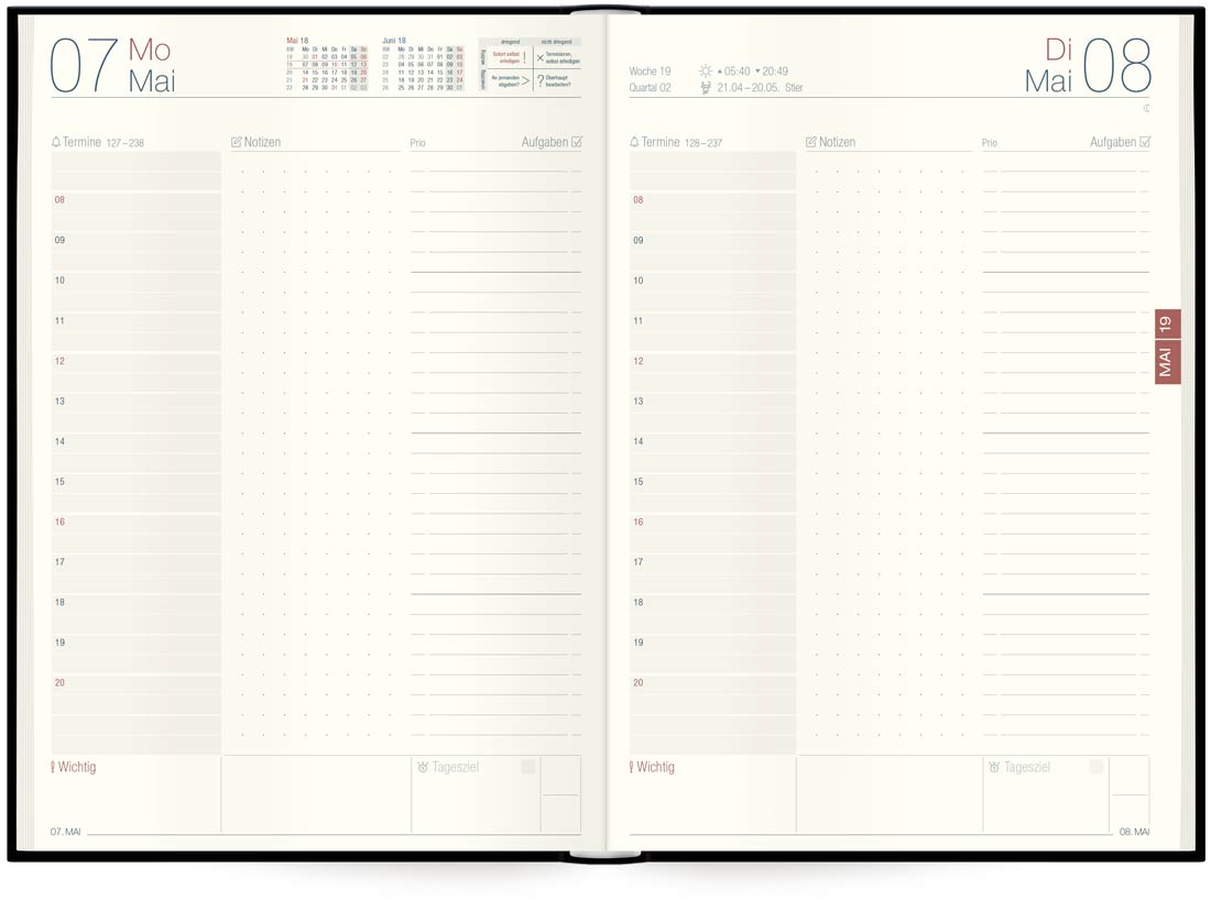 Der Tageskalender bietet reichlich Platz für Aufgaben, Termine und Notizen, denn: 1 Tag, 1 Seite. Zusatzseiten, wie Wochenplan oder Landkarten, sind ebenfalls vorhanden.