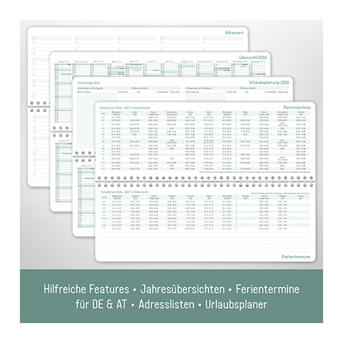 Der Tischkalender beinhaltet zudem weitere Features wie Sonnenauf- und -untergangszeiten, Monatsvorschauen, Sternzeichen und Steuertermine. Zur Auflockerung des Alltags regen wöchentliche Sprüche zum Nachdenken und Schmunzeln an. Im Außenteil finden sich eine Jahresübersicht, Ferientermine für Deutschland und Österreich, Urlaubsplanung, Adressfelder, Kleidergrößen und Krawattenknoten sowie freie Listen.