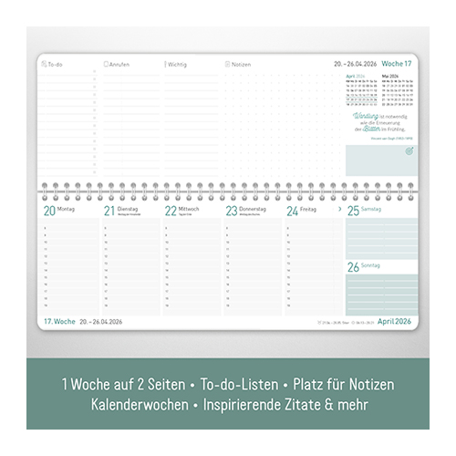 Der Kalender verfügt über eine zweiteilige Struktur: Unten die Woche im Überblick, oben die Orga-Hilfen wie To-do-Listen, Anruflisten und das Wochenziel. Somit bietet der Kalender genug Platz zum Notieren von Terminen, Aufgaben und allem, was sonst noch wichtig ist!