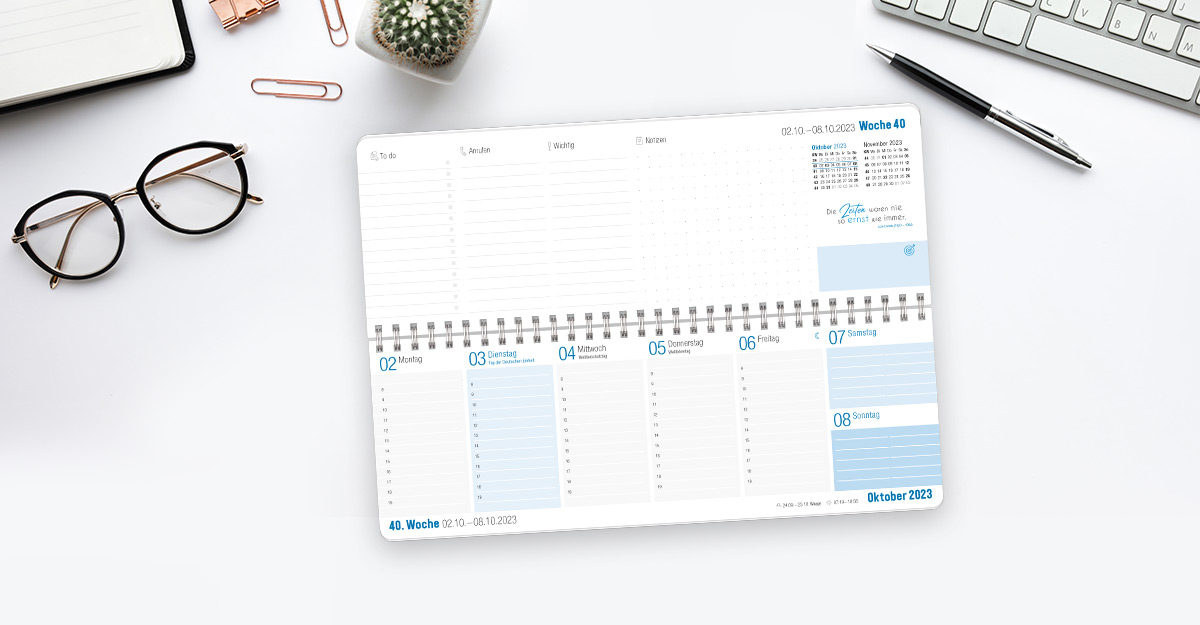 Der Kalender verfügt über eine zweiteilige Struktur: unten die Woche im Überblick, oben die Orga-Hilfen wie To-do-Listen, Anruflisten und das Wochenziel. Somit bietet der Kalender genug Platz zum Notieren von Terminen, Aufgaben und allem, was sonst noch wichtig ist!