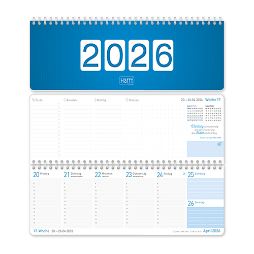 Dieser Querkalender kommt farblich ganz klassisch daher, findet auf jedem Schreibtisch seinen Platz und ist mit seiner Aufteilung der optimale Terminplaner.