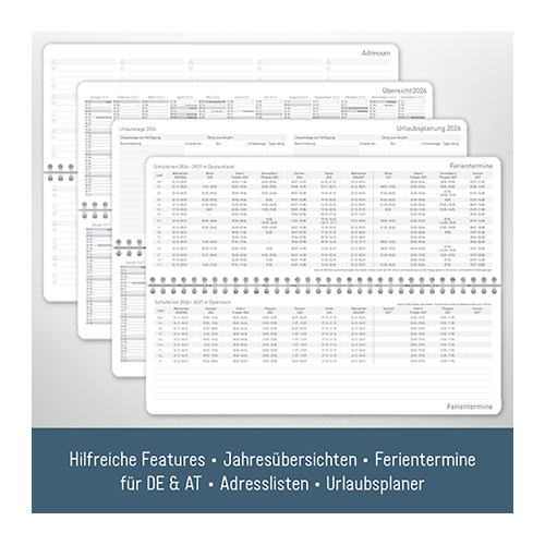 Der Tischkalender beinhaltet zudem weitere Features wie Sonnenauf- und -untergangszeiten, Monatsvorschauen, Sternzeichen und Steuertermine. Zur Auflockerung des Alltags regen wöchentliche Sprüche zum Nachdenken und Schmunzeln an. Im Außenteil finden sich eine Jahresübersicht, Ferientermine für Deutschland und Österreich, Urlaubsplanung, Adressfelder, Kleidergrößen und Krawattenknoten sowie freie Listen.