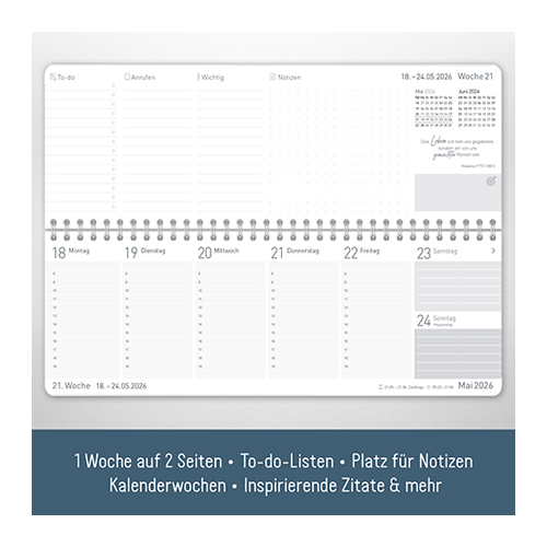 Der Kalender verfügt über eine zweiteilige Struktur: unten die Woche im Überblick, oben die Orga-Hilfen wie To-do-Listen, Anruflisten und das Wochenziel. Somit bietet der Kalender genug Platz zum Notieren von Terminen, Aufgaben und allem, was sonst noch wichtig ist!
