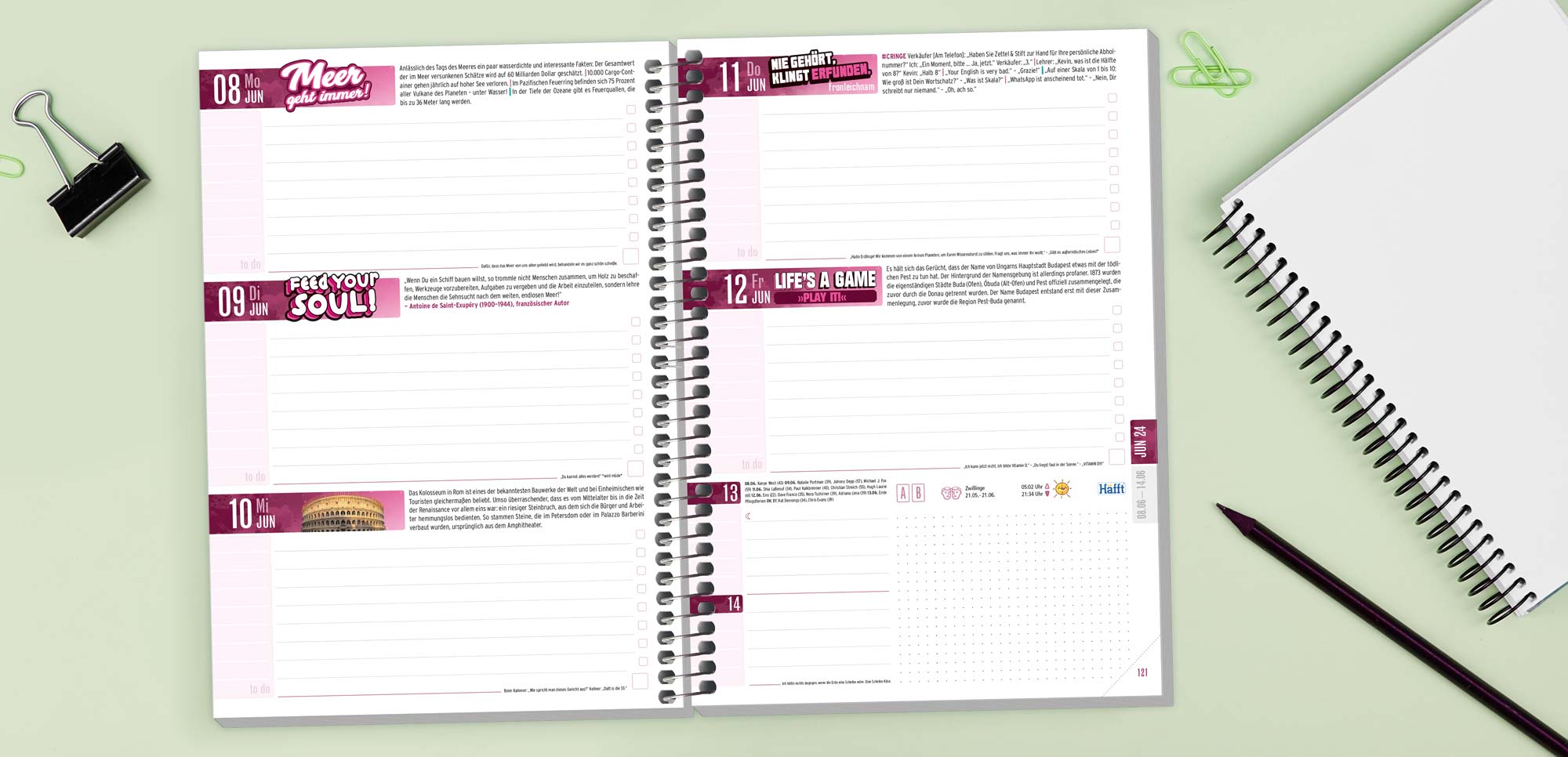 Mit stabiler Spiralbindung, veredeltem Softcover, durchdachtem Kalendarium und jeder Menge Wissen und Spaß im Gepäck – So wird der Schulalltag garantiert nicht langweilig!