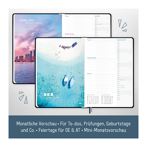 Der Kalender bietet viele Zusatzseiten, die den Alltag garantiert erleichtern – Adressfelder, Notenlisten, Lern- und Prüfungslisten, essenzielles Schulwissen, Ziele und Projekte, Landkarten, Lifehacks, Urlaubsplaner u. v. m.