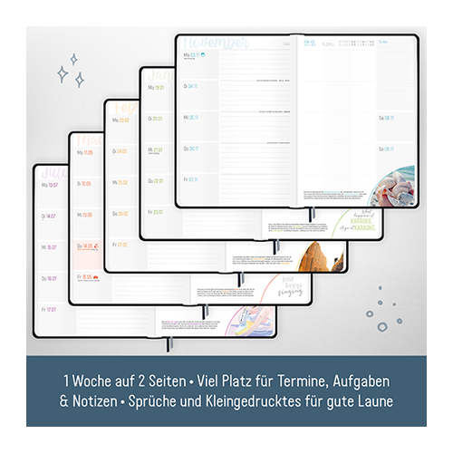 Der Schülerkalender hat eine Laufzeit von August 2025 – September 2026 und inspiriert durch witzige Sprüche + Funfacts sowie stimmungsvolle Bilder. 1 Woche ist auf 2 Seiten abgebildet, um reichlich Platz zum freien Befüllen anzubieten. Die jeweilige Monatsvorschau, vier Stundenpläne sowie zahlreiche Zusatzseiten bringen Übersicht in den Schullalltag.