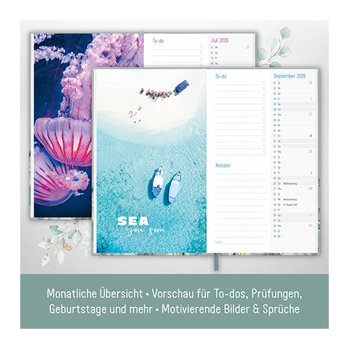 Der Schülerkalender hat eine Laufzeit von August 2025 – September 2026 und inspiriert durch witzige Sprüche + Funfacts sowie stimmungsvolle Bilder. 1 Woche ist auf 2 Seiten abgebildet, um reichlich Platz zum freien Befüllen anzubieten. Die jeweilige Monatsvorschau, Stundenpläne sowie Zusatzseiten bringen Übersicht in den Schullalltag.