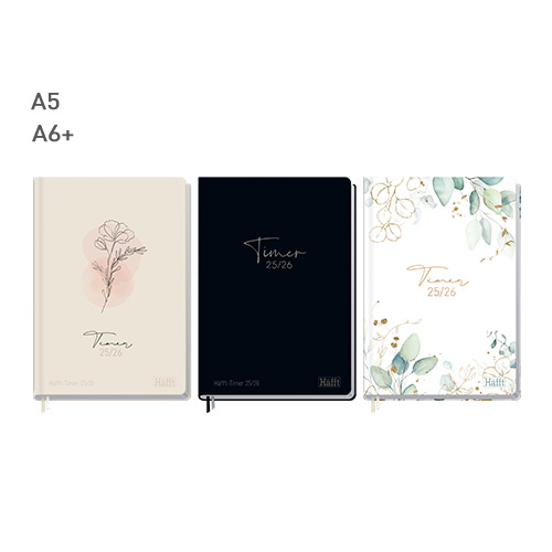 Die langlebige Fadenheftung und das abwischbares Hardcover mit den abgerundeten Ecken macht den Häfft-Timer im A5-Format und im A6-Format zum täglichen Begleiter.