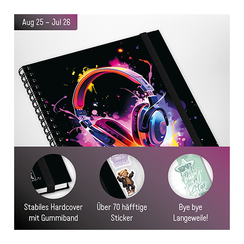 Für Hausaufgaben, Termine und Notizen von August 2025 – Juli 2026. Mit jeder Menge Spaß im Gepäck: Gags, Illus, Spiele, Sticker und lustige Sprüche in Massen!