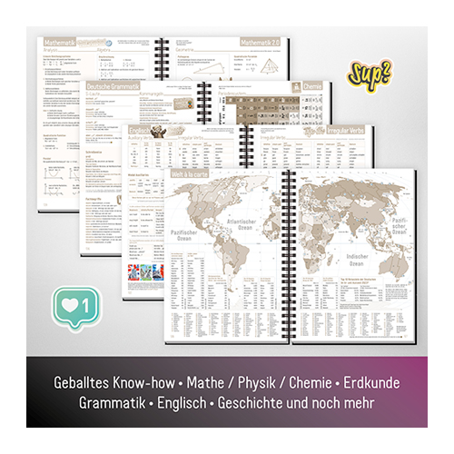 Notenlisten, Ausfragelisten, Prüfungsübersichten, Lernpläne, Adressfelder, Landkarten, Lifehacks, Grammatik, Formeln für Mathe / Physik, Chemie, Periodensystem u. v. m.